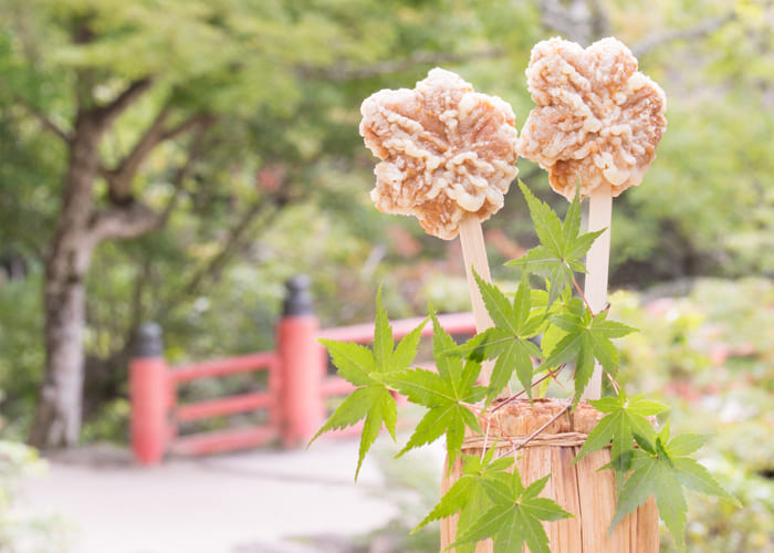 2002年に誕生した「揚げもみじ」は、紅葉屋の職人さんたちが試行錯誤を繰り返し完成させた大ヒット商品です。揚げたてをその場で食べられるようにアメリカンドッグのように竹串にささっており、お土産には向いていないでしょう。また、揚げもみじを冷たいソフトクリームに乗せた揚げもみじソフトなるアイデア商品も登場しています。1個180円で、注文すると目の前で揚げてくれます。